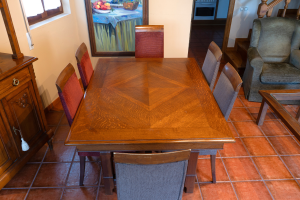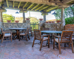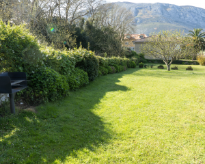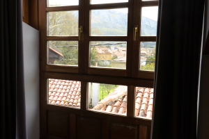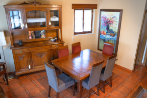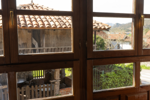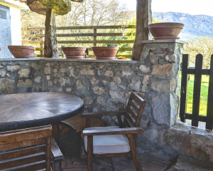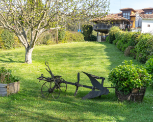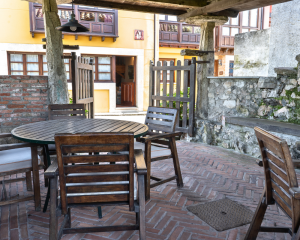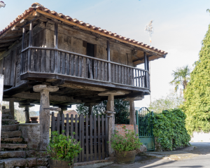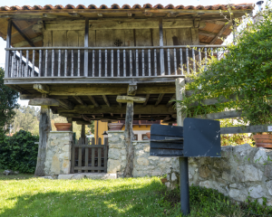 Frente a la casa encontramos el hórreo (construcción típica asturiana para guardar la cosecha), bajo éste se puede disfrutar de una comida al aire libre. Tras el hórreo está la finca y el aparcamiento, todo ello cerrado para uso particular de los apartamentos