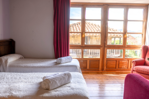 - Planta primera: dormitorio 1 (dos camas de 0,90 m), dormitorio 2 (dos camas de 0,90 m) y baño